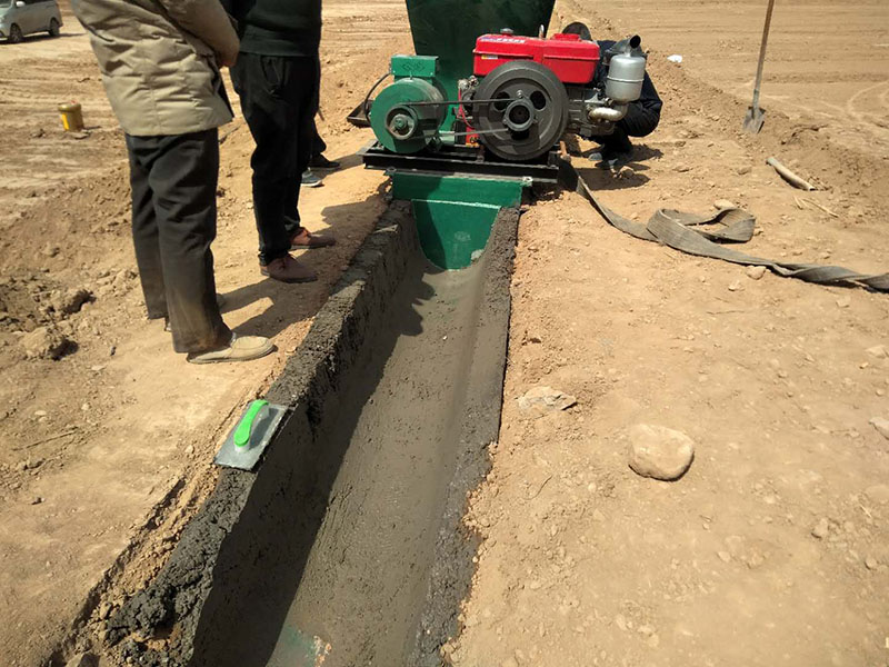 把機(jī)器放到挖好的溝模里面,啟動柴油機(jī),打開攪拌功能,啟動油泵,料斗上料。機(jī)器開始自動完成渠道成型機(jī)工作。因?yàn)槊總€(gè)地方的使用的水渠和沙子不同,第一次試機(jī)的時(shí)候成型都不會太美觀。如下圖。